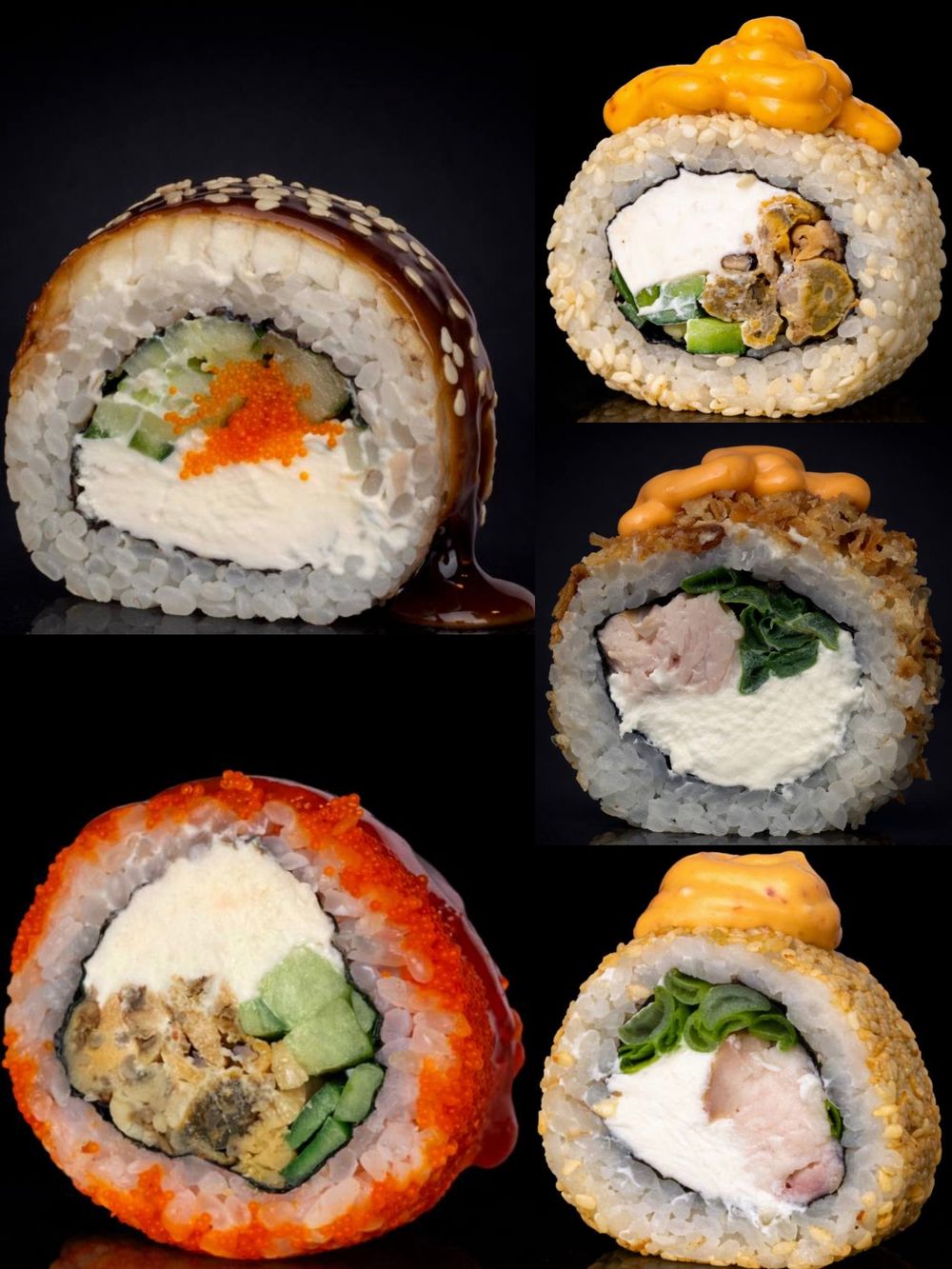 Роллы стандартные или с двойной порцией начинки. Канда Калифорния с мидиями Чикен кранч Чикен ким-чи Милия кужут.