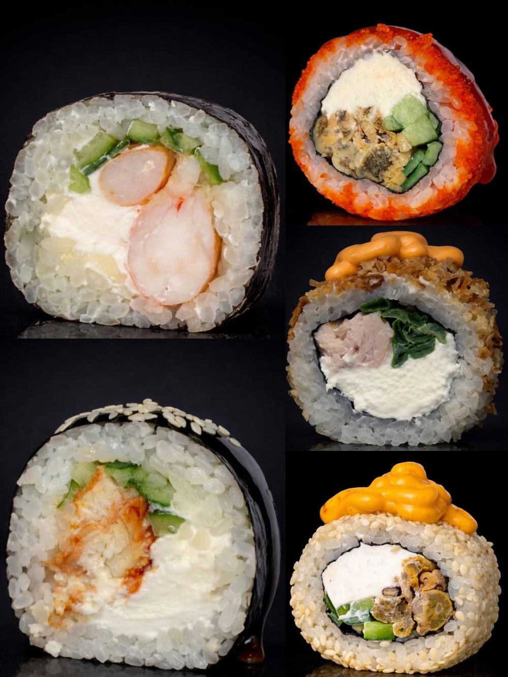 Роллы стандартные или с двойной порцией начинки. Унаги мак Эби мак Калифорния с мидиями Мидия в кунжуте Чикен кранч