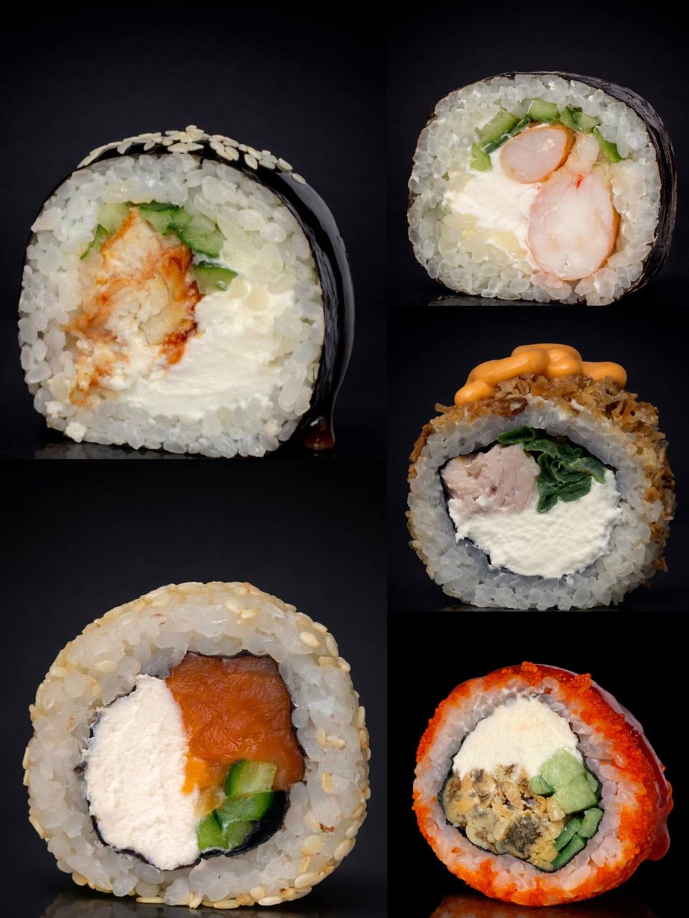 Роллы стандартные или с двойной порцией начинки. Унаги мак Лосось в кунжуте Эби мак Калифорния с мидией Чикен кранч.